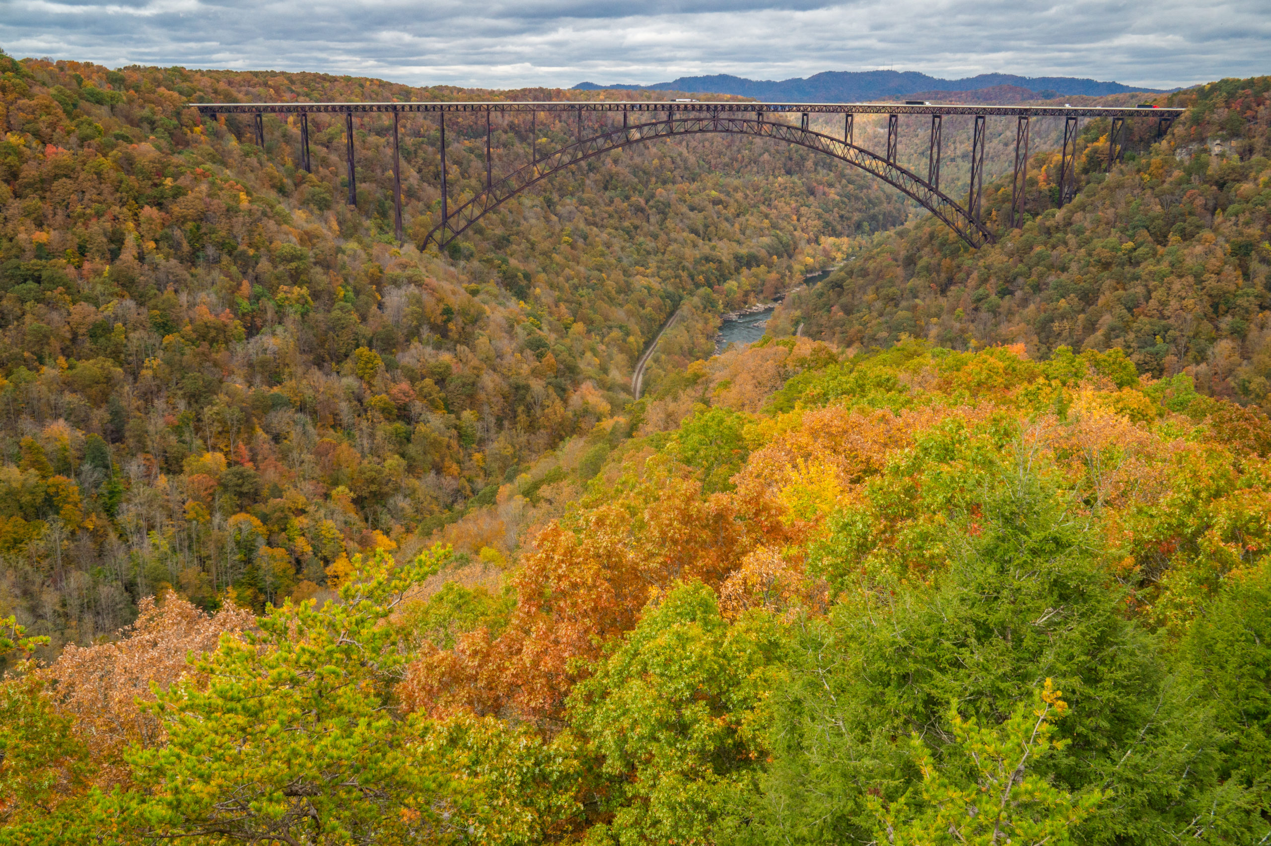 The biggest attraction to the park beside the river is the bridge on Hwy 19 crossing the Gorge. This bridge is the longest single-arch bridge in the western hemisphere and the 3rd tallest vehicular bridge in the US. It was the highest bridge in the world until 2001 and since has fallen to 34th, mostly behind bridges that have been constructed in China. There are many trails to view this bridge, but in my opinion, the best view comes from the Long Point Trail. This moderate 1.2-mile trail takes you to a spectacular view of the bridge from down the gorge. Fall color was just taking off when I visited.