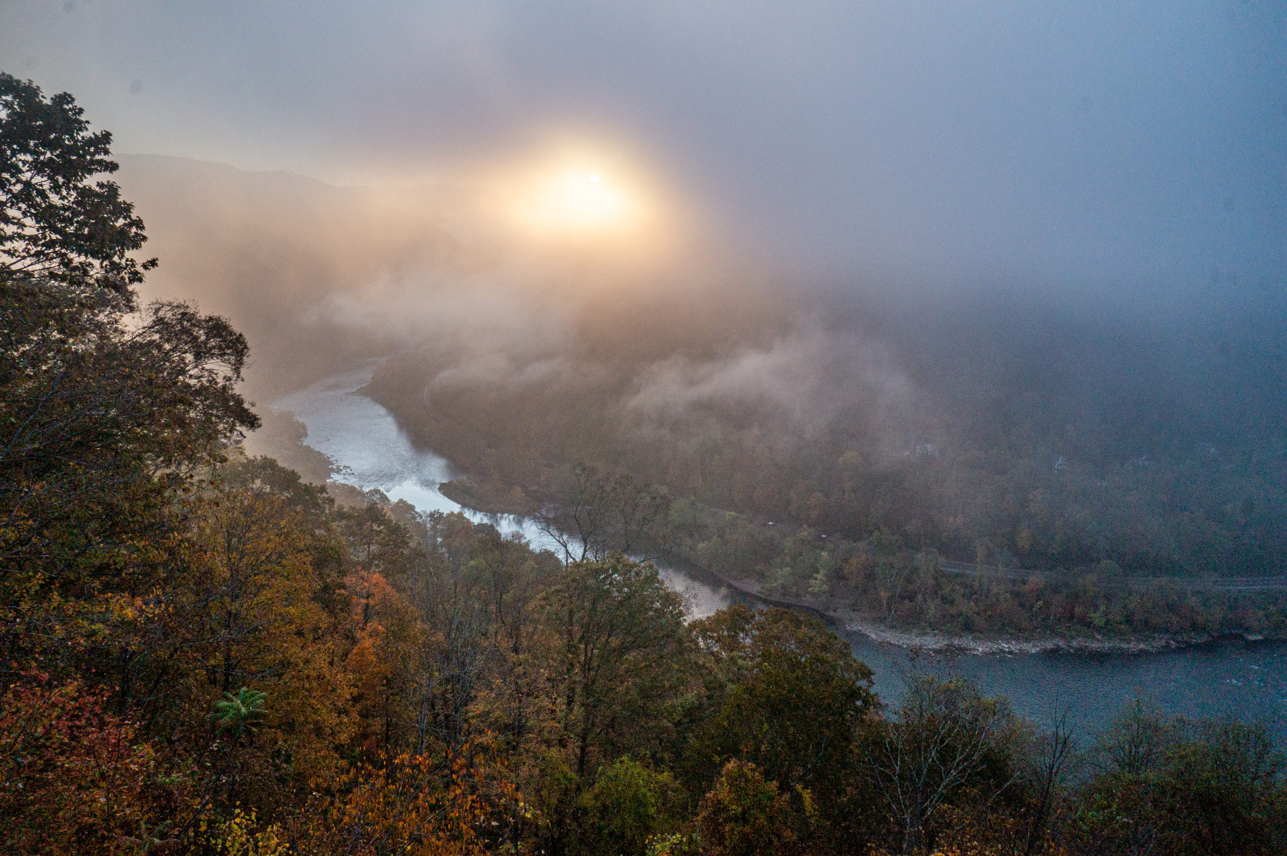 Located about 20 minutes away is the Concho Rim Overlook. Like Beauty Mountain, this overlook is located on private property, this time on the ACE Adventures campus. They graciously allow access to this spot. It is located directly across the river from Thurmond, WV, an old mining town that has been well preserved as a testament to the once common mining towns that dotted the entire gorge. You get a great view of the railroad tracks from this overlook as well so keep an eye out for the many coal trains running the river below.