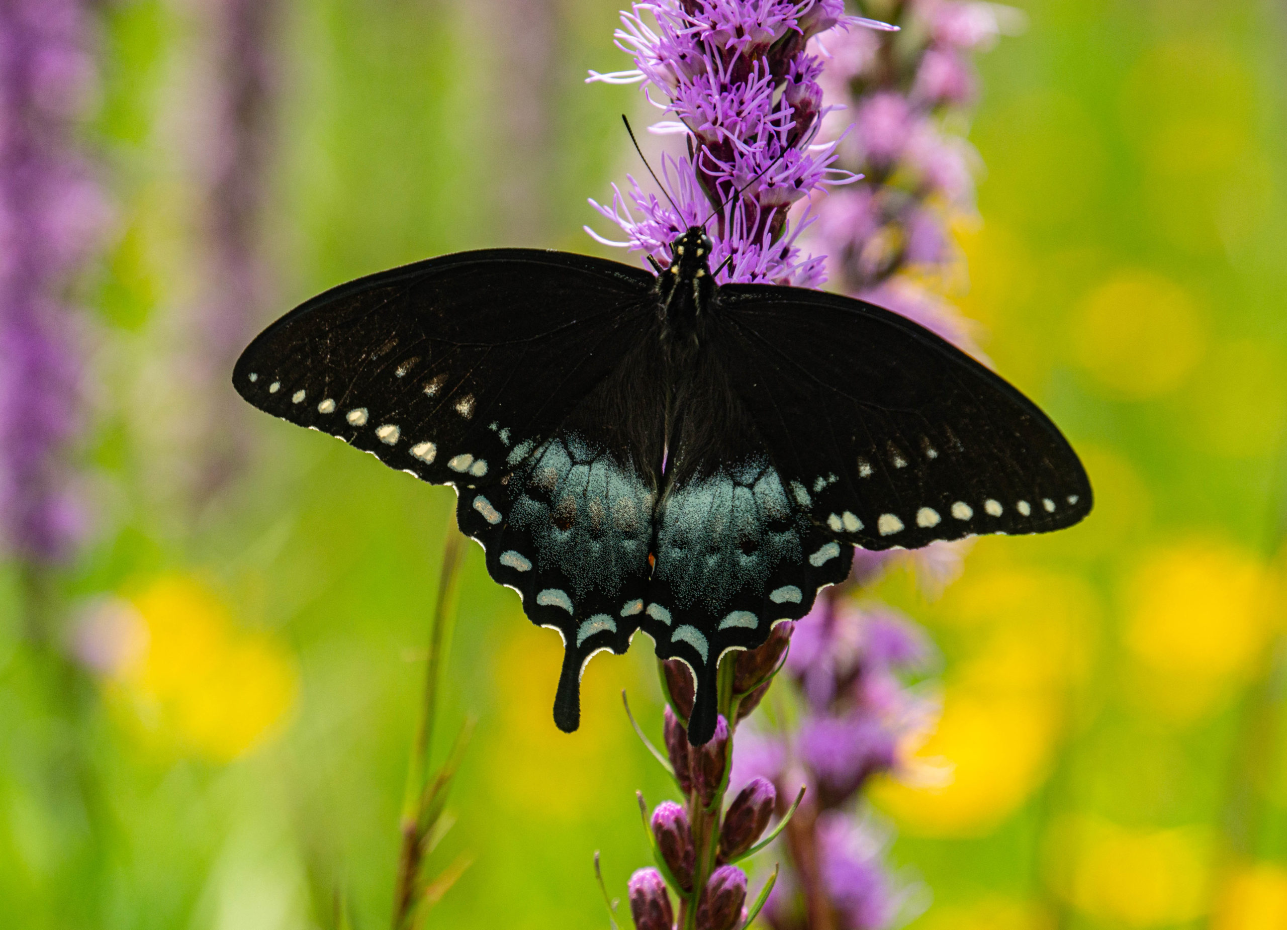 The flowers are primarily found in a meadow next to the old abandoned Bluff Lodge. A couple of trees grow out in the middle, offering some shade if you plan to spend much time out in the sun, but you’ll never be far from the car. These Blazing Stars and other assorted wildflowers attract a multitude of butterflies and bees. Everything from monarchs to swallowtails to fritillaries to honeybees can be found enjoying the plentiful nectar. If you are lucky, you may even spot a quick-moving Ruby-Throated Hummingbird coming through.
