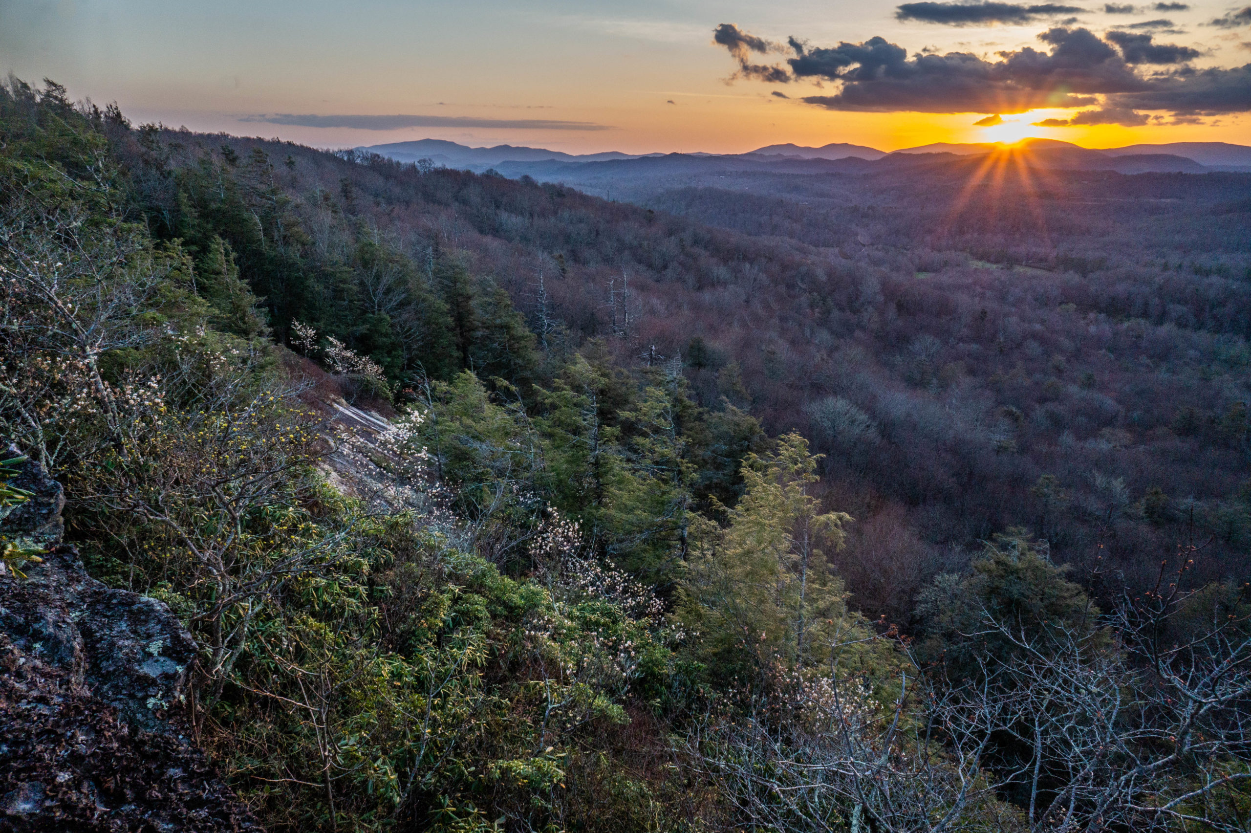 Despite my anger with the disrespect, the sunset didn’t seem to mind as it put on a dazzling show. The first touches of spring are just reaching the higher elevations of the Southern Appalachians, with dogwood blooms and red leaf sprouts tinging the brown trees.