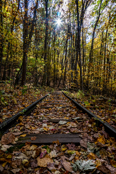 Just a few miles north at MP34 you will find the Yankee Horse Overlook. This isn’t an overlook of a view, but rather a short hike to Wigwam Falls and, more importantly to me, railroad tracks. The tracks are not original but were reconstructed on an old railroad bed as a reminder of the many logging trains that used to run the mountains. I arrived perfectly timed to catch the sun breaking in-between the leaves.