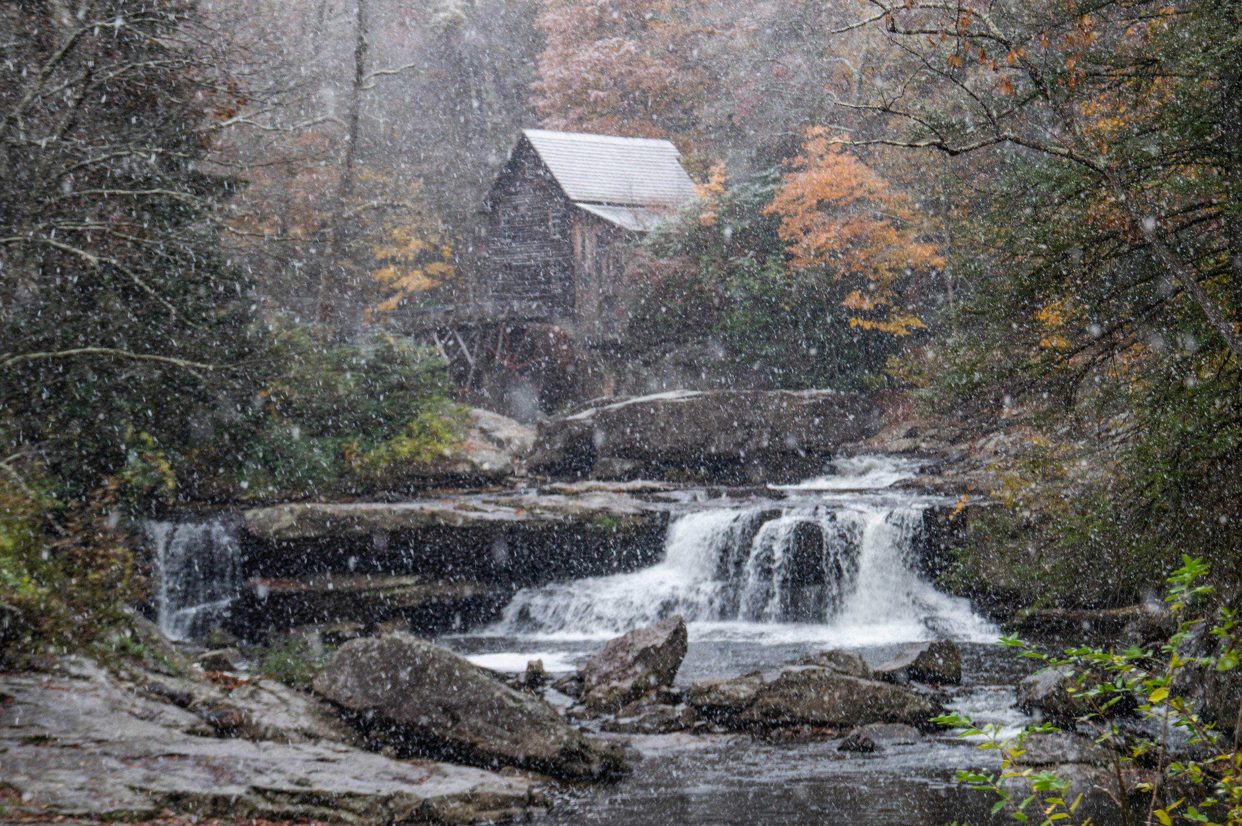 It was snowing pretty hard at times on my drive there but temperatures were just warm enough to keep the roads from freezing up. Temps around 30-31 were just enough to get the snow to stick to the trees and grass, but the closer to the park I got, the less it was sticking. I got to Babcock around 8:30 and began making my rounds. For the first hour the snow was falling pretty hard making long exposure shots somewhat difficult. Even short exposure times were completely obscured by the falling flakes.