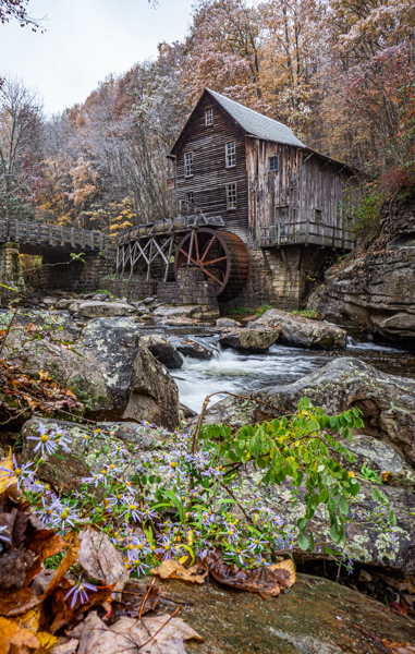 I took advantage of this time to get some closer shots of the mill and get some longer exposures during the brief times when the snow let up. This shot is one of my favorites as it is a clash of not two, but three seasons. The purple flowers in the bottom left, fall foliage and snow all at once.