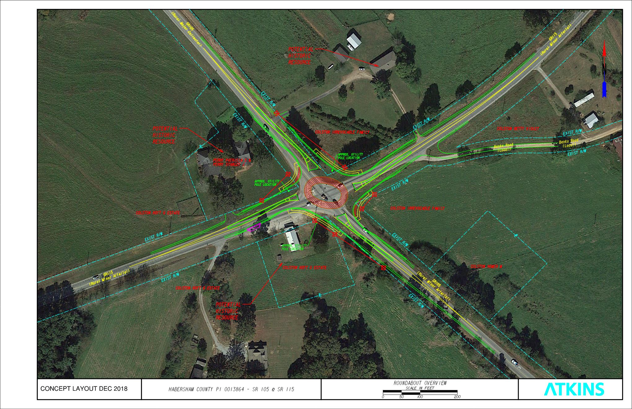 GDOT’s current plan for the roundabout takes those concerns into consideration, with roundabout entrances and exits going between businesses like Stoney’s and the gas station at the intersection. The current roads at that intersection would stay where they are to become entrance and exit points for the roundabout.
