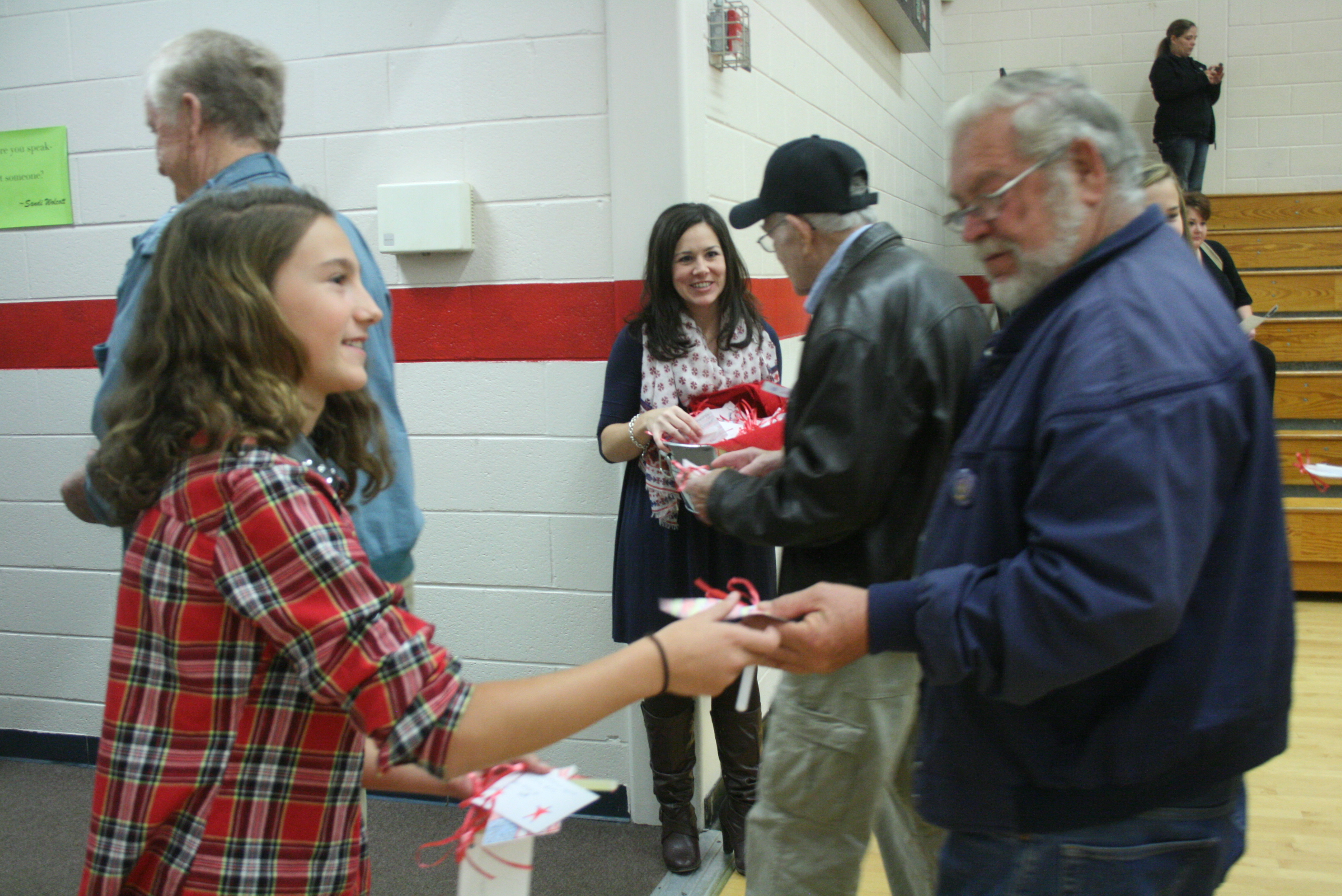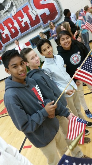 Eighth grade students Nevaja Brown and Nancy Mora shared the letters they had written expressing gratitude for the many sacrifices our Veterans have made. Seventh grade students Erika Phapakdy and Grace Ward presented their Veterans Day poems. Sixth grade students Avery Smith and Ellis Wallace read their essays and both described veterans as heroes. A common theme among all of the writings was the importance of honoring those who sacrifice for our freedom and truly appreciating these sacrifices.