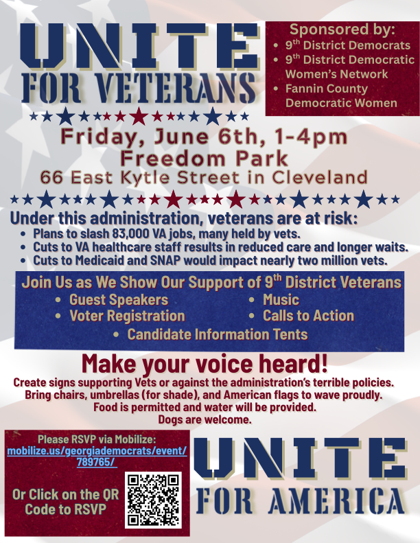 The event is sponsored by the Georgia 9th Congressional District Democrats, the Georgia 9th District Democratic Women’s Network, and the Fannin County Democratic Women’s organization.