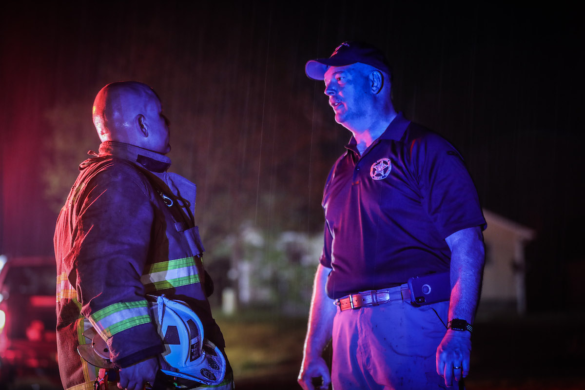Habersham County Sheriff Joey Terrell speaks with a firefighter at the scene on Harrison Trail in Alto where several residents were trapped inside their homes by fallen trees. (Daniel Purcell/Now Habersham)