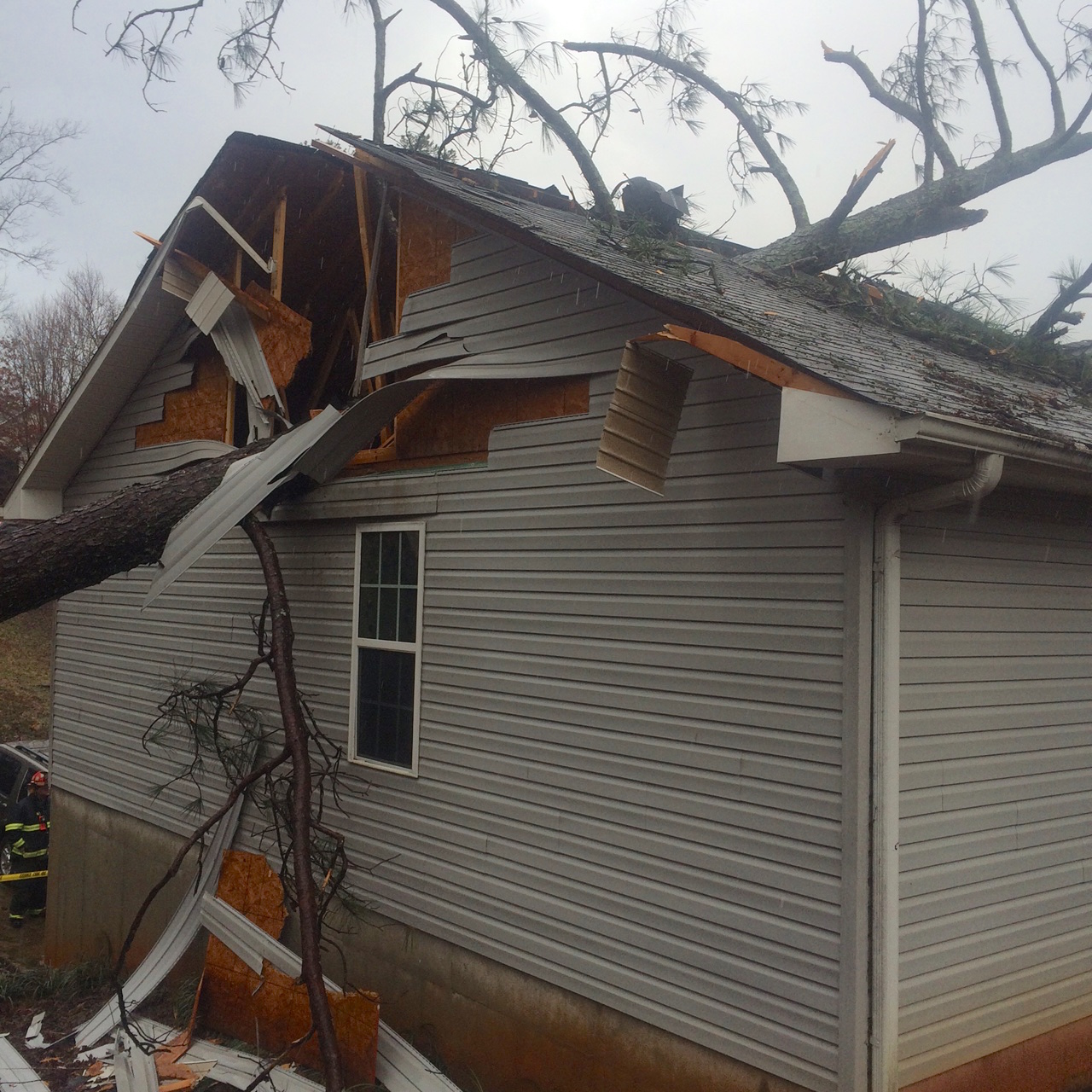 Hope Crawford lives behind the house that was damaged. She snapped the above photo from her back porch after calling for help. “I heard the crash and immediately went looking outside and saw the damage to the house behind me,” she says. “I called 911 and they confirmed that the people inside had just called in to report the damage.”