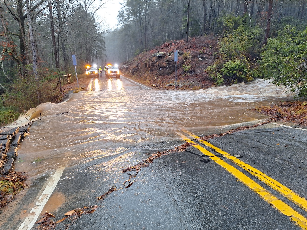 Department of Transportation workers and local county road crews in Banks, Habersham, Franklin, White, and other counties continue to clear blocked roads from trees and other debris. Barricades have been set up to warn drivers of flooding and other road hazards.