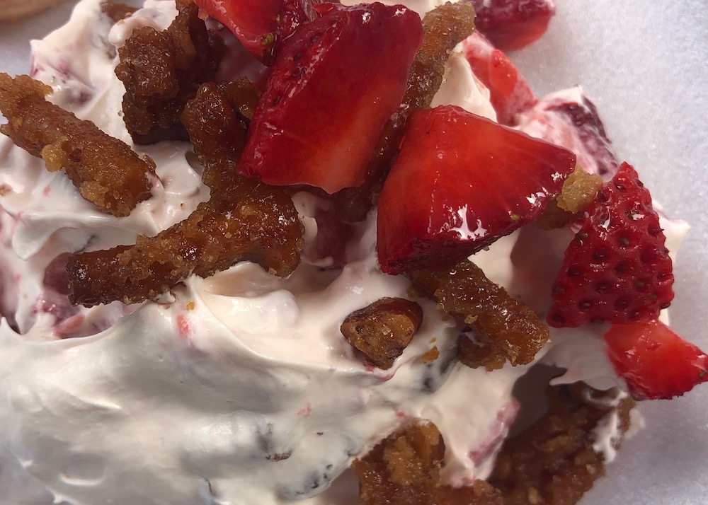 - Before serving, add the diced strawberries and sugared pretzels and pecans into the cream cheese mixture and mix well.