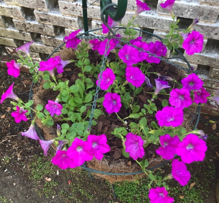 I usually don’t do a single variety planting in one container but this year I put one deep pink petunia in a 16″ wire basket with a coco liner, and boy is she happy! Kinda lonely in the beginning but now spreading, as they do, and spilling down all sides.