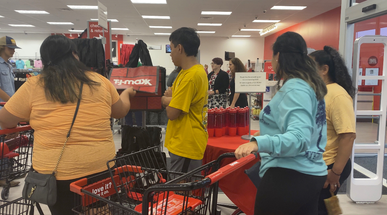 While T.J. Maxx has its avowed fans, it’s likely to attract even more locally because of the economy. The store sells name-brand merchandise at discounted prices. Well over a hundred shoppers stood in line to take advantage of the deals and pick up some grand opening freebies. The company handed out T.J. Maxx shopping bags and water bottles to thank shoppers for supporting its new store.