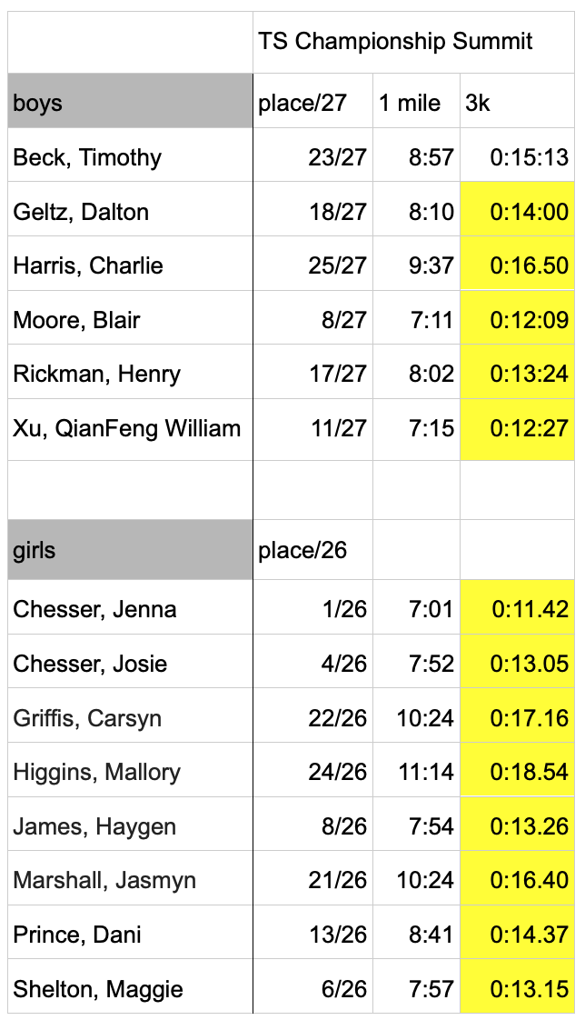 Haygen James placed eighth while Dani Prince ran a personal record to place 13th. Every TFS girl ran a PR on this fast, mostly flat 3k course around the Summit Charter school including Jasmyn Marshall, Carsyn Griffis, and Mallory Higgins.