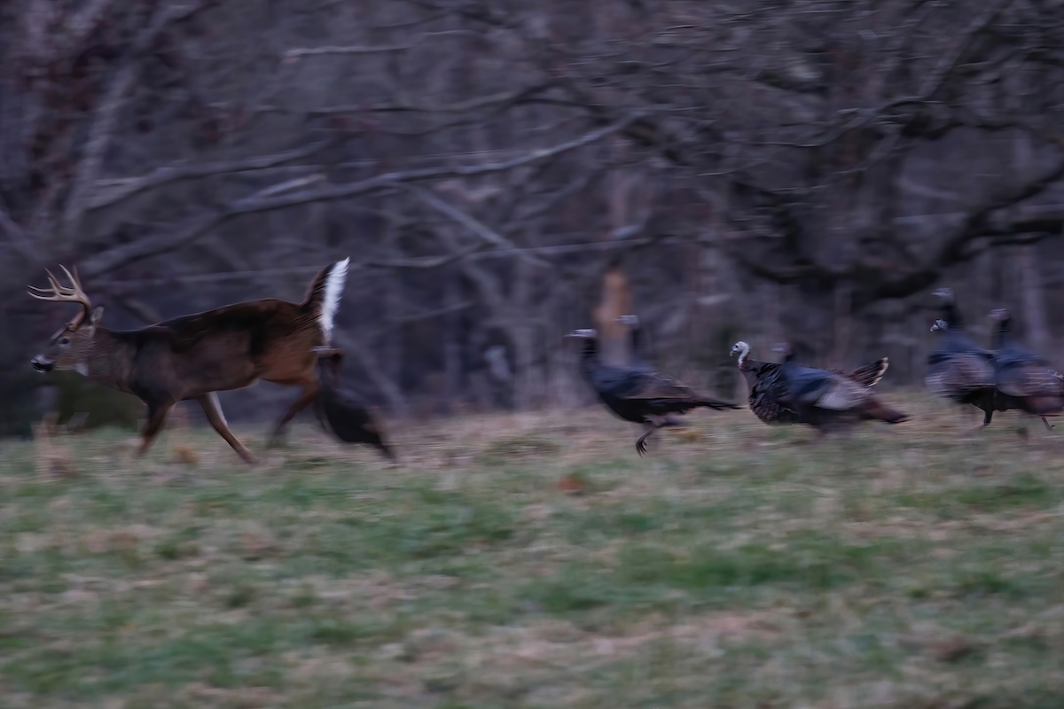That buck wasn’t going to let a gobbler stand in his way. He took a poke at the bird with his horns.