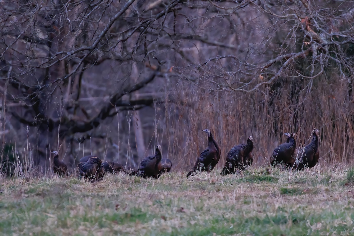 As the morning slowly grew brighter to reveal actual images rather than the hallucinations my imagination had created from memory, faint images began to emerge from the trees into the hayfield. A flock of turkeys had just come off their roost. They were starting to feed and occasionally spook a bit, making low yelps and clucking calls as they got to the top of the hill in the hayfield.