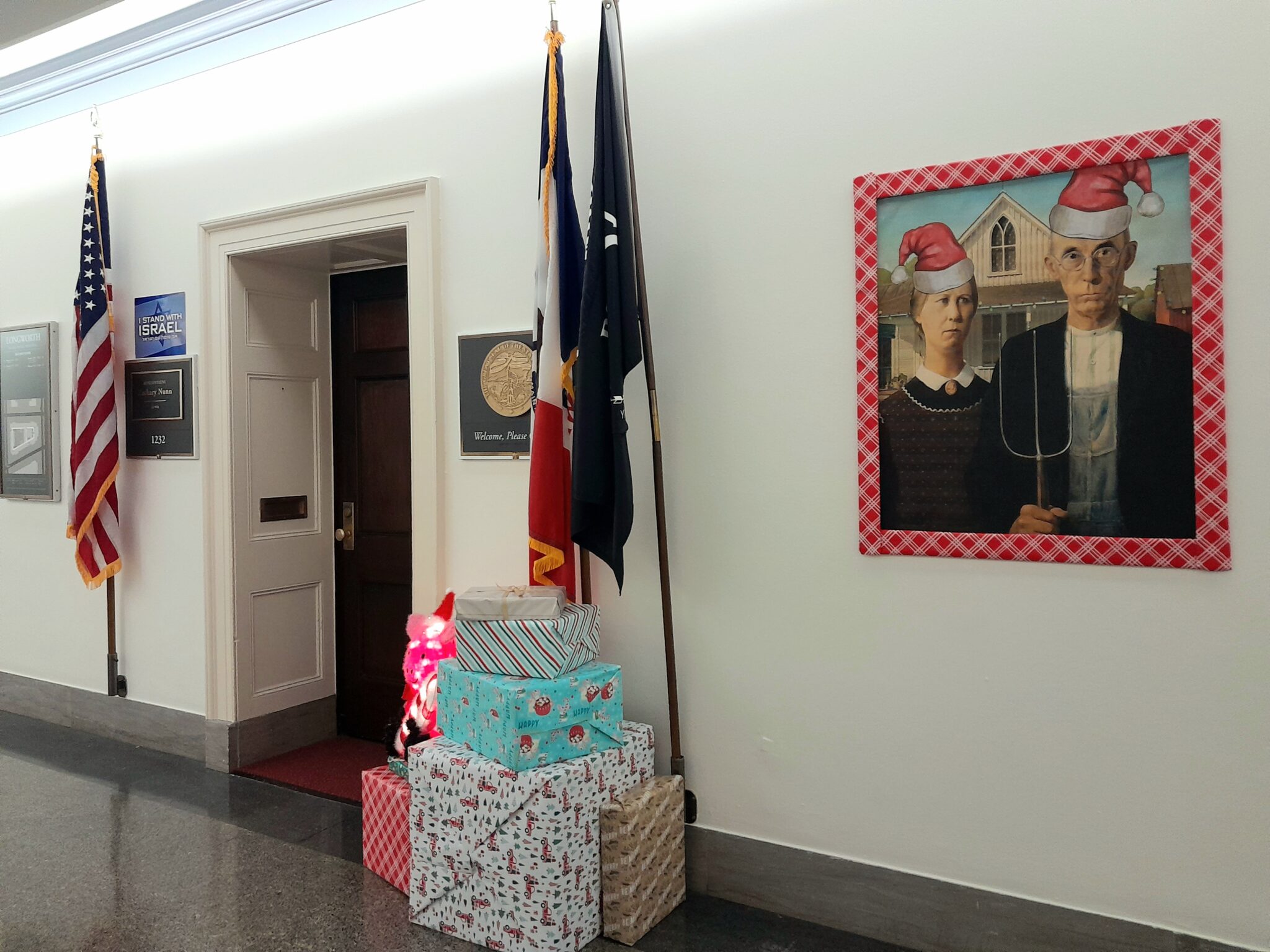 Iowa’s Rep. Zach Nunn leaned hard into his state’s proud farming culture and exhibited a clever Christmas twist on Grant Wood’s 1930 “American Gothic” painting. A little bright-pink light-up pig also sits on a pile of presents just outside the Iowa Republican’s door.