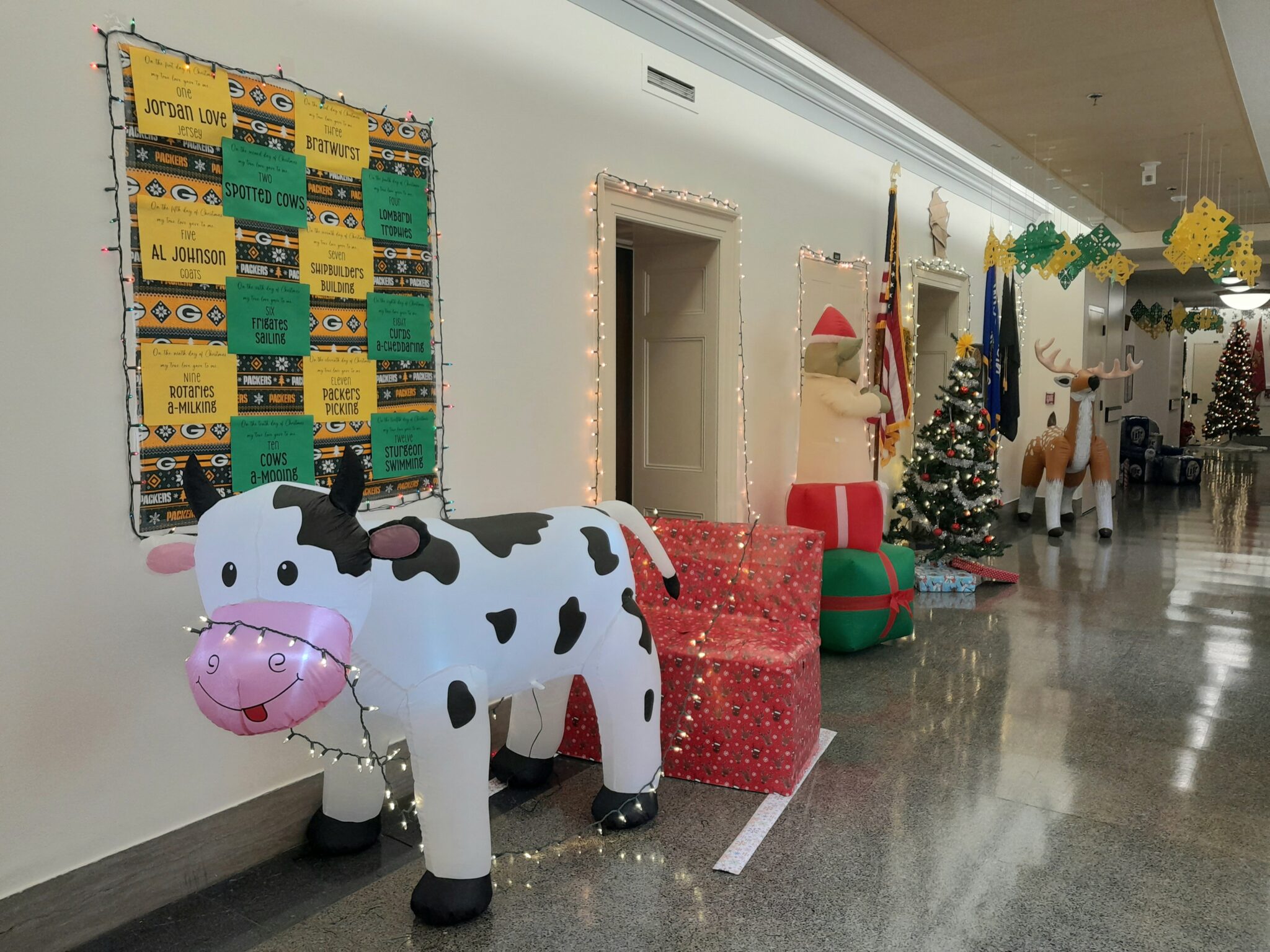 Not far down the hallway, an impossible-to-miss inflatable cow stands near a milking bench wrapped in red festive reindeer paper just to the left of Wisconsin GOP Rep. Mike Gallagher’s door. A bulletin board above the cow covered in Green Bay Packers logos featured what can be described as the 12 days of Wisconsin Christmas. “Four Lombardi Trophies,” “Nine Rotaries a-Milking,” “Twelve sturgeon swimming” … you get the idea.