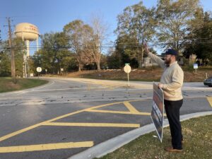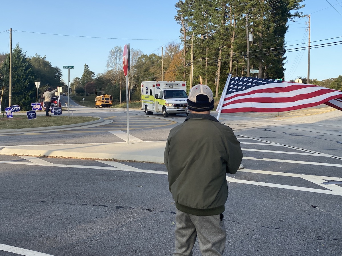 Republican District 50 State Senate candidate Bo Hatchett got in some last-minute campaigning, waving to voters as they drove to the Habersham North Precinct at the Ruby Fulbright Aquatic Center in Clarkesville. Hatchett was joined by a flag-waving, self-described “proud American” who told Now Habersham there’s a lot riding on this election.