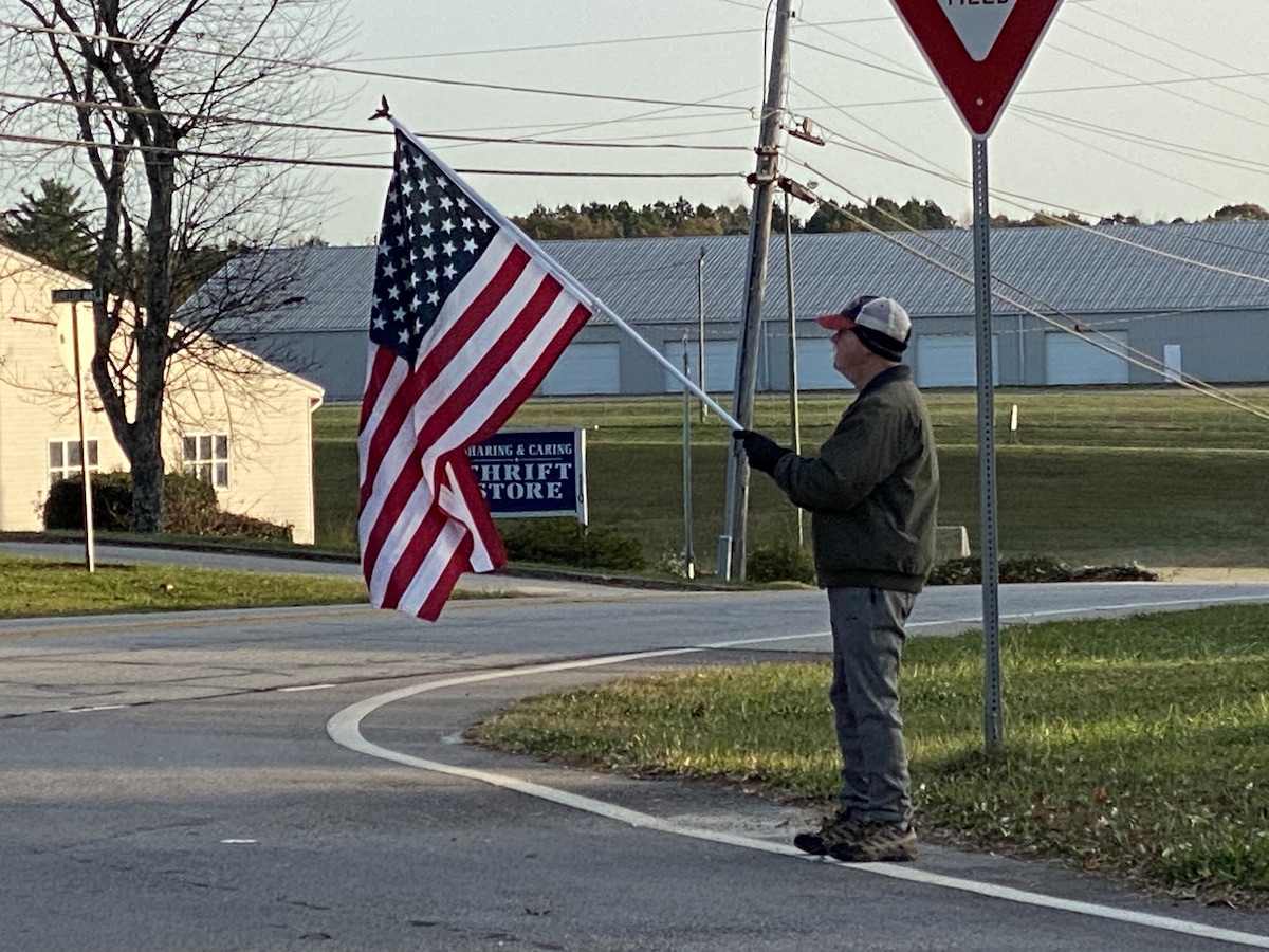 “For those who don’t understand what’s on the line today, I feel sorry for them,” he said. When asked to describe in his words what is on the line, he looked at the flag in his hands and responded, “I’m hanging on to it right here. Red, white, and blue. Not red. Not blue. Red, white, and blue.”