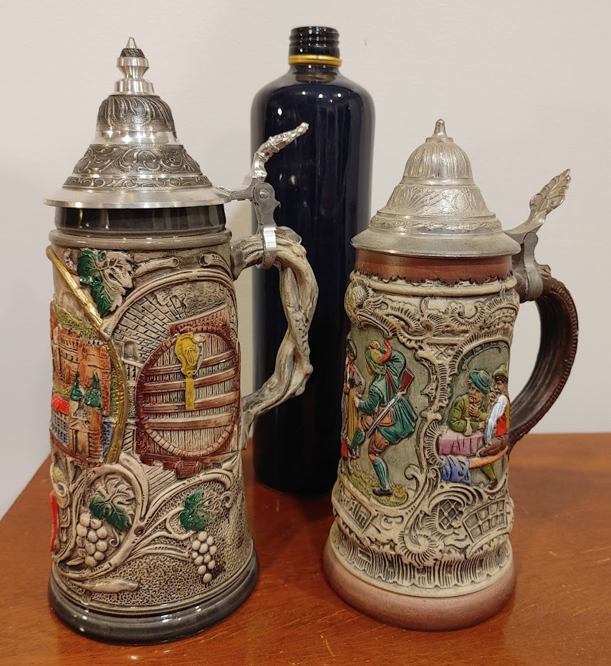 You know how shoppers feel about that one customer who holds everyone else up because they buy so much stuff? Yeah, me too. And since I happened to be that person, I decided to go back to the car and unload, then return to check out the sale items. This was a good move because by the time I finished carefully packing things into my car, the checkout line was gone and I was able to score these two German beer steins and this cobalt blue salt-glazed bottle for half price!