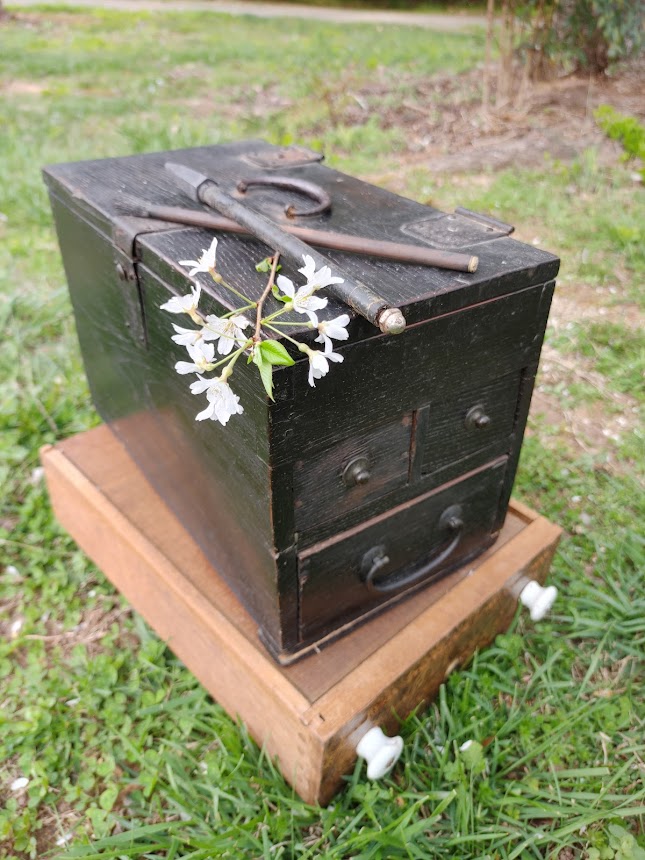 I loved browsing around amidst the unique pieces and was happy to discover one of my favorite things to sell in my online shop: an antique Japanese box. With a compartment under the lid, plus three drawers, this one is designed to hold a calligraphy set. It still had some brushes and a tool in it, too! Other than a broken clasp, the box is in good shape. I paid $65 for it and will list it in my online shop for about $145. If I can repair the clasp, I’ll price it a little higher than that.