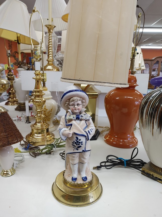 For example, when I was there, all lamps were $5! I picked up this one, custom-made from a vintage German Gebruder Heubach figurine. (I later dismantled the lamp in order to sell the figurine separately.) I also purchased a wicker lamp and a 1960s crystal lamp, both of which will easily sell in my area.
