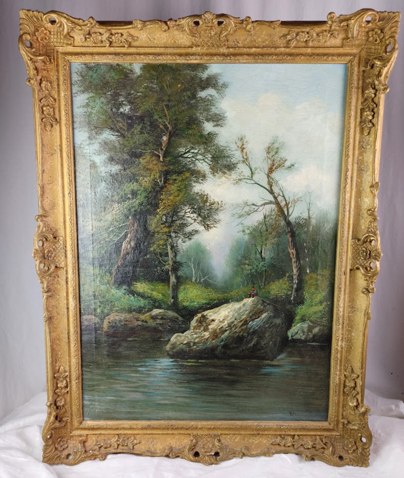 This is an original antique oil painting. Based on the darker color of the canvas, the style of the art, and the crazing of the paint, I believe it hails from the late 19th or early 20th century. The piece has some minor issues, including the gesso on the frame needing a little repair, but it is still a great find. It’s one of those pieces that require additional research to ascertain the value, so I am going to hold on to it for a while until I can determine what that value is. Still, I am sure this oil painting is easily worth a hundred dollars and probably worth a good deal more.