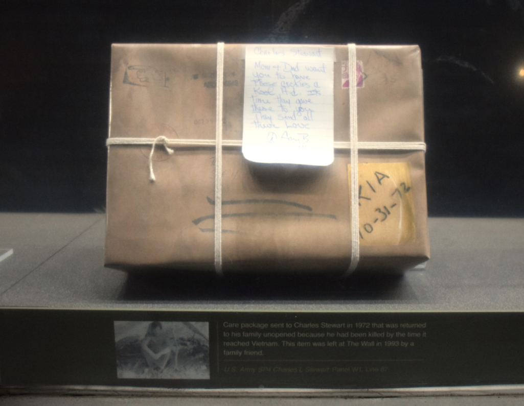 Another moving tribute left at the Wall in Washington, D.C. that is in the Mobile Education Center is a care package. The care package was originally sent to Charles Stewart who was serving with the U.S. Army in Vietnam in 1972. However, it was returned to his family unopened. Stewart was killed in action on October 31, 1972. The unopened care package was placed at the Wall in 1993, 21 years after it was originally sent.