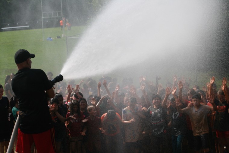 SHMS coach John Krippner hoses off students during the finale of the Rebel Challenge (PHOTO/SHMS).