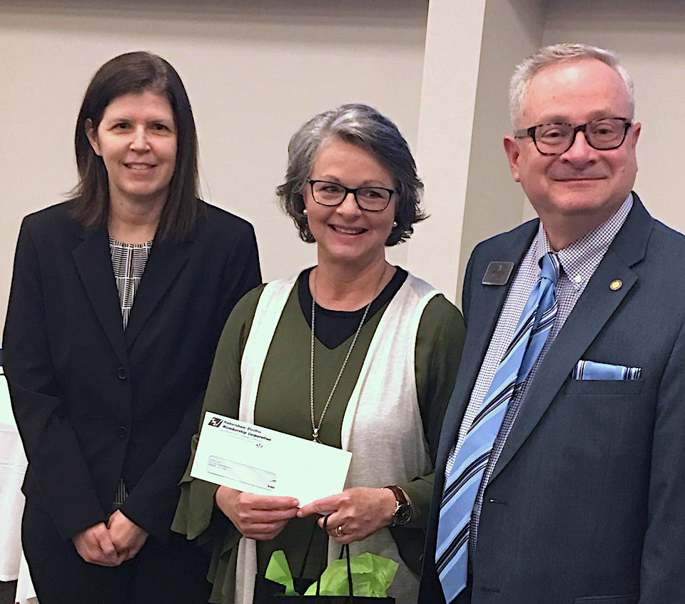 Teacher of the Year winner Leah Thomas, center, is pictured with award sponsors John Fair of Peach State Federal Credit Union and Kelly Wilkins of Habersham Electric Membership Corporation.