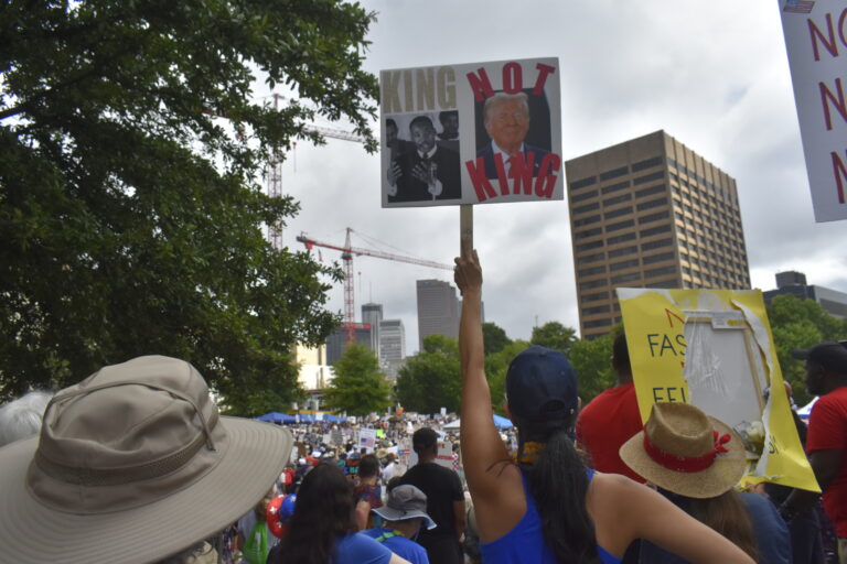 The name of the event is a reference to what opponents say is Trump’s desire to subvert democracy and rule as an autarch, but many signs made reference to a different kind of King – civil rights icon Martin Luther King Jr., who called Atlanta home. Several protesters held signs saying King is the only king recognized in Atlanta.