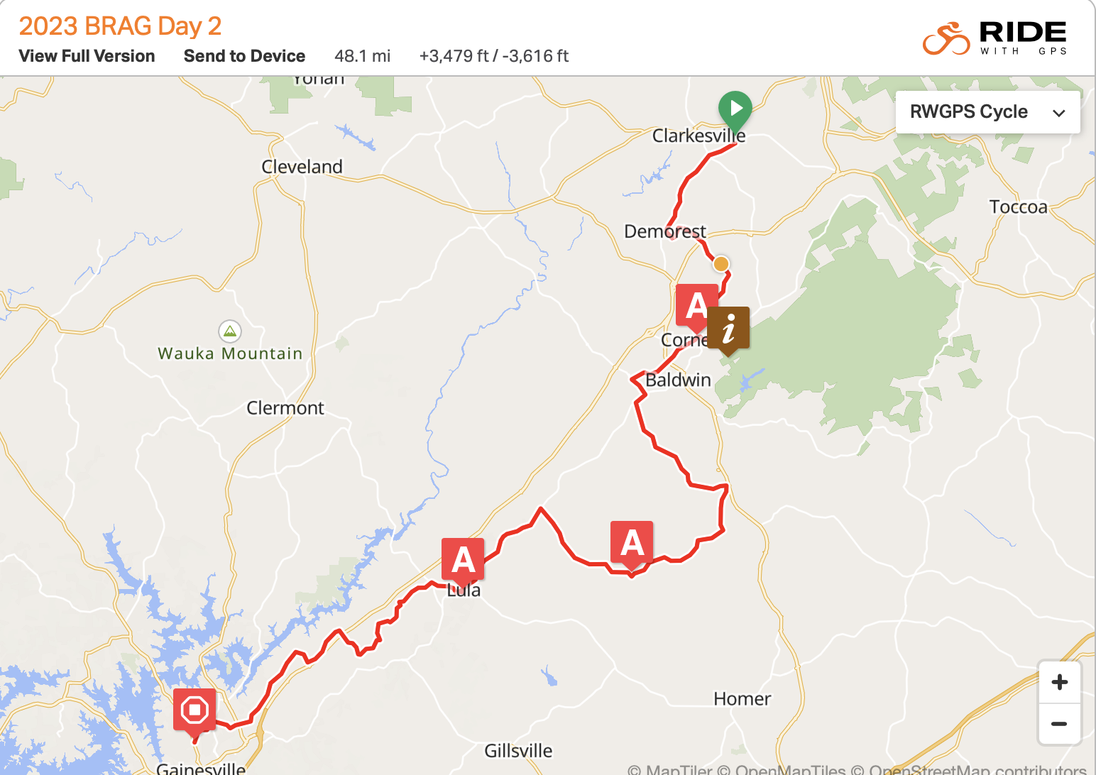 BRAG riders will arrive in Clarkesville between 9:30 a.m. and 2 p.m. on June 4. From the Clarkesville square, they’ll travel to Rocky Branch Road, where they’ll cut across Toccoa Highway/Hwy 17 to the Aquatic Center.