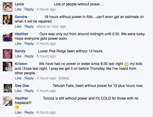 For those without power the repairs can’t come soon enough. Social media’s abuzz with comments from people across northeast Georgia who’ve been left without lights – and heat – for hours, many since eight o’clock last night.