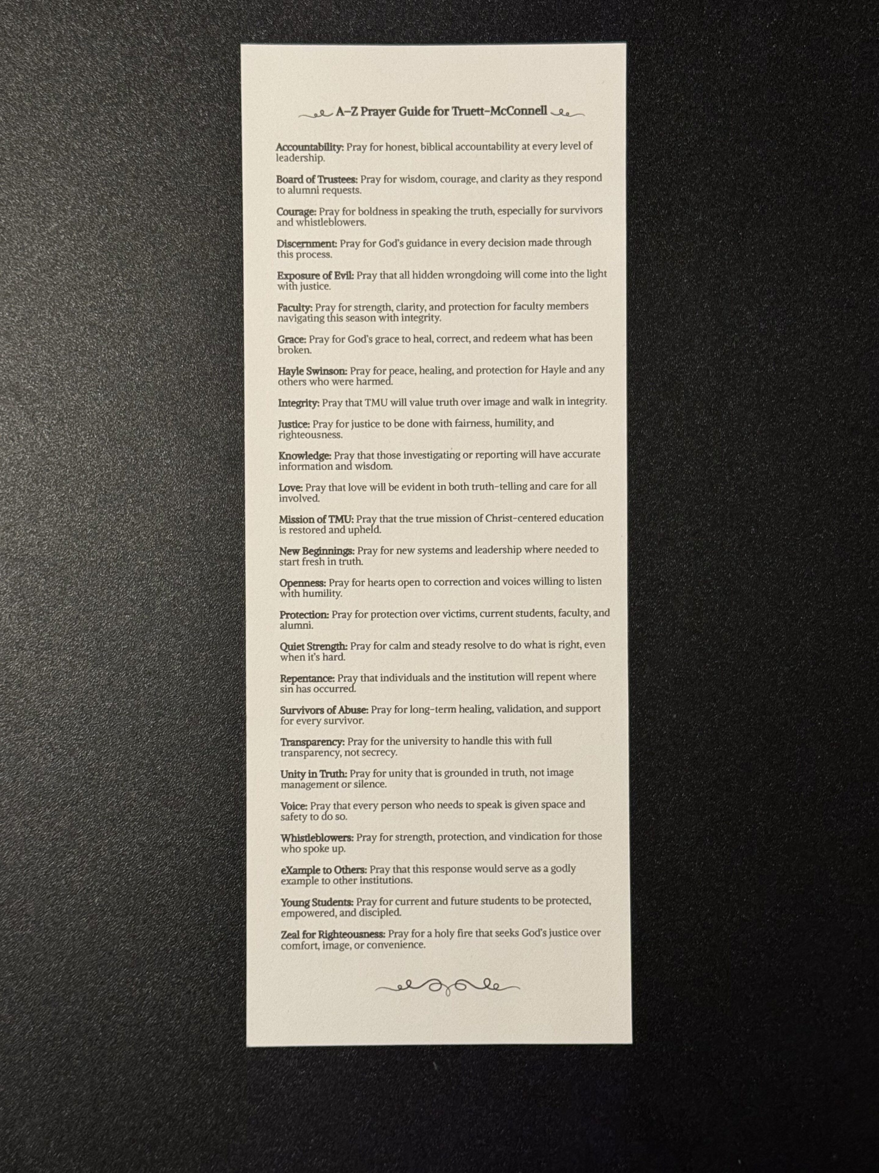A prayer guide was given out to all in attendance, titled “A-Z Prayer Guide for Truett-McConnell.” The list names various words alphabetically to be prayed for in support of the victims of the scandal.