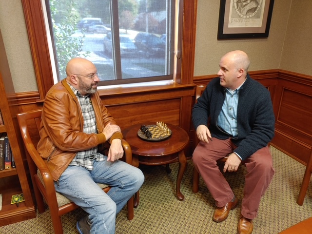 Dr. Mael Disseau, right, speaks with TMU President Dr. Emir Caner. Disseau will be the first professor to occupy the Dr. Charles F. Stanley Chair of Theology at TMU. (Truett McConnell University)