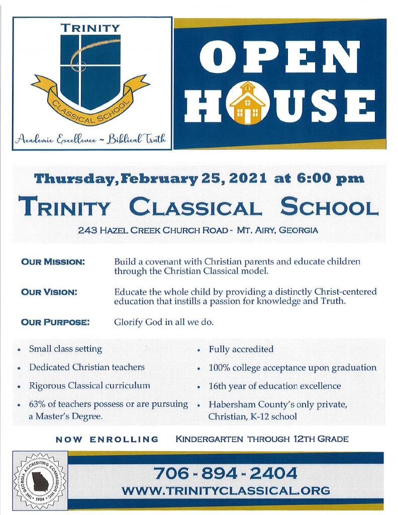 Trinity Classical School in Mt. Airy is holding an Open House from 6-8 p.m. for parents and prospective students. Come meet the Titans’ dedicated staff, learn more about the exciting things that are happening at Trinity, and pick up an application packet for the 2021-2022 school year.