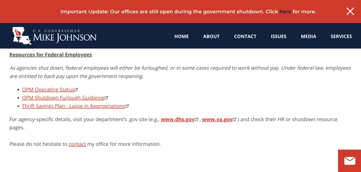 U.S. House Speaker Mike Johnson’s website on Oct. 7, 2025, stating, “Under federal law, employees are entitled to back pay upon the government reopening.” (States Newsroom screenshot)
