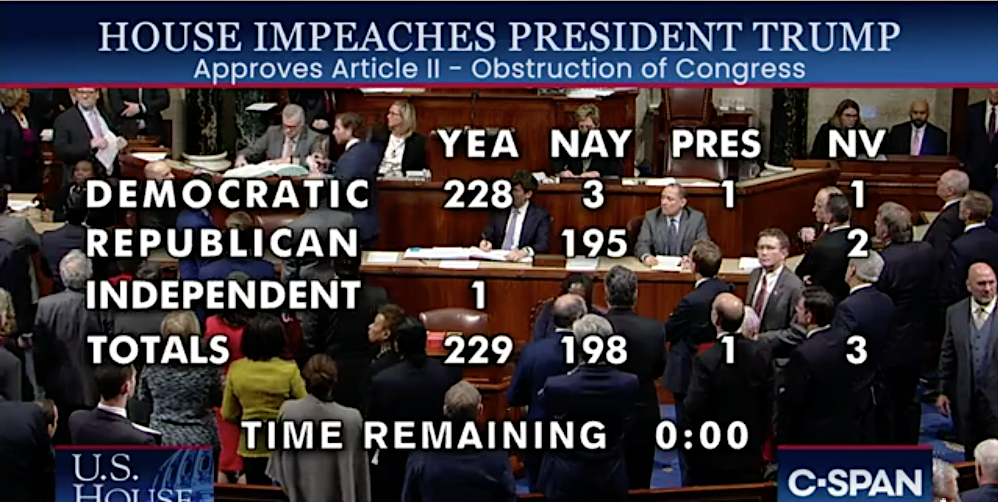 The House vote on Wednesday was 230 to 197 on the first of two articles of impeachment — abuse of power — with one member voting present. The House then passed the second article — obstruction of Congress — with a vote of 229 to 198, with one member voting present, according to NPR.