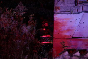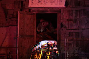 Emergency responders work to free a woman trapped inside a car that crashed into a wooden storage building on Talmadge Drive late Monday night. (Daniel Purcell/Now Habersham)