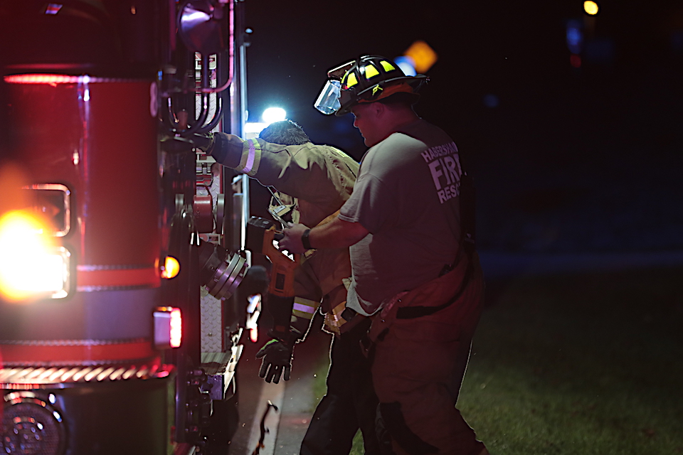 Emergency responders work to free a woman trapped inside a car that crashed into a wooden storage building on Talmadge Drive late Monday night. (Daniel Purcell/Now Habersham)