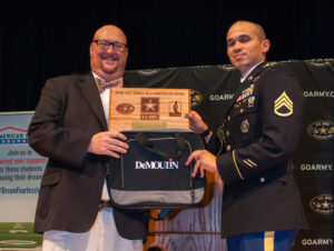 Also onstage was Dillon’s nominator for the award, the director of Habersham’s Band of Blue, Ryan Dukes. He said onstage that Dillon embodies the qualities of a leader, quoting John C. Maxwell as he said, “A leader is one who knows the way, goes the way, and shows the way.” Dukes also said that he has known Dillon since fourth grade, when he “hung around the drumline,” in which his sister Dianna performed as a percussionist in the Band of Blue. Dukes congratulated Dillon, “both musically and academically” and called him “a wonderful, upstanding young man.”