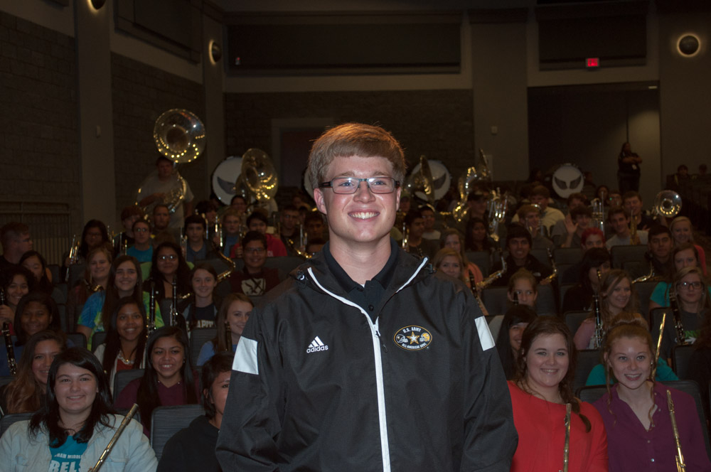 Senior Dillon Caudell, son of Doug and Donna Caudell of Mt. Airy, had been chosen as a member of the U.S. Army All-American Band for 2015. Onstage Friday, he received from the U.S. Army officers the jacket he will wear as he marches and plays bass drum in the All-American band on Saturday, January 9, in San Antonio, Texas, at half-time when the U.S. Army All-American football game is held.