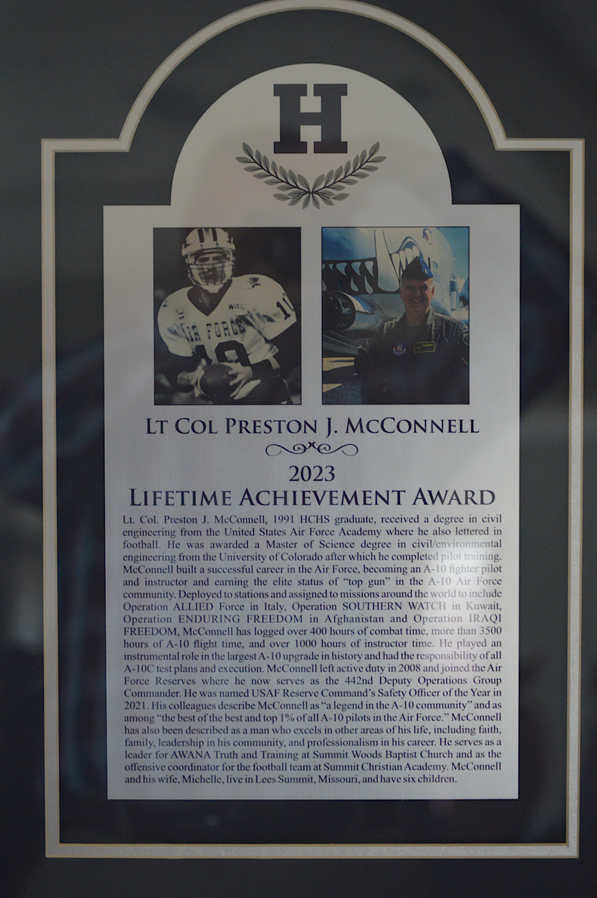 An exemplary student who lettered in football, LTC McConnell graduated from HCHS in 1991. He received an appointment to the United States Air Force Academy, where he also lettered in football and earned a degree in civil engineering. He earned his Master of Science degree in civil and environmental engineering from the University of Colorado.