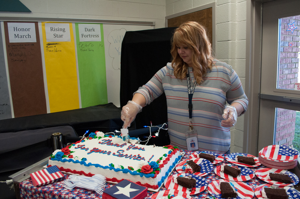 Then the lights in the gym went dark. One line of focused light appeared, showing two long tables on the floor of the gym. Two lines of nearly 25 standing students could barely be seen on each side of the gym. Each student was holding a large, empty cardboard box. A retired Veterans Day tradition had been revived.