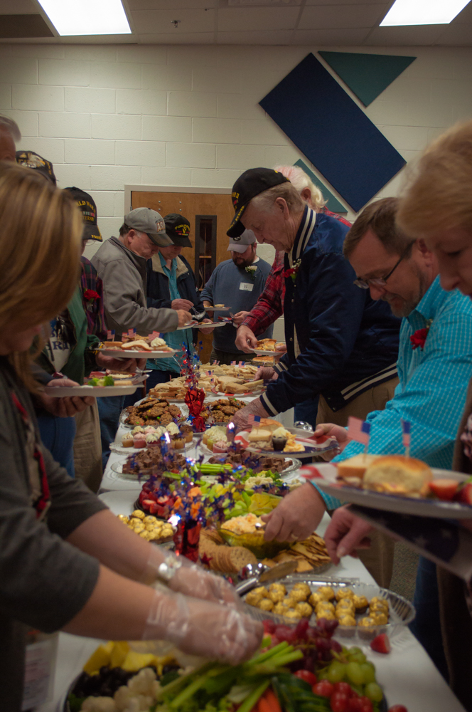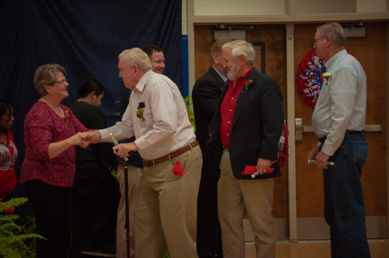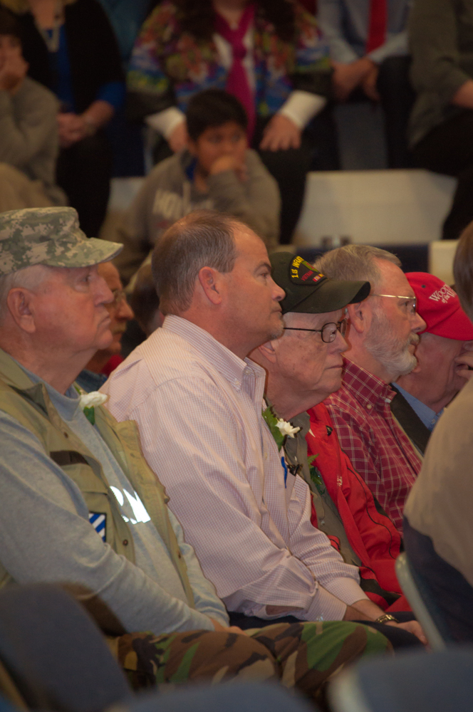 He spoke from the podium in the school gym. Veterans from all five branches of the Armed Forces were seated in black chairs on the floor. Both of his grandfathers had been veterans, and he praised World War Two veterans – 16 million men and women known as “the greatest generation,” who likely “saved the world from Hitler and the Empire of Japan.” He asked for all World War Two veterans seated in the gym to stand – adding that most would be “in their nineties now.”