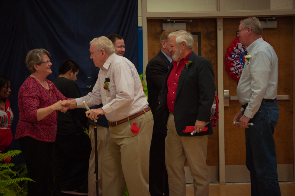One veteran began to stand slowly, then another – and then, all the veterans seated in the gym, all the students, all the teachers rose to their feet and applauded the elderly gentlemen in the group.