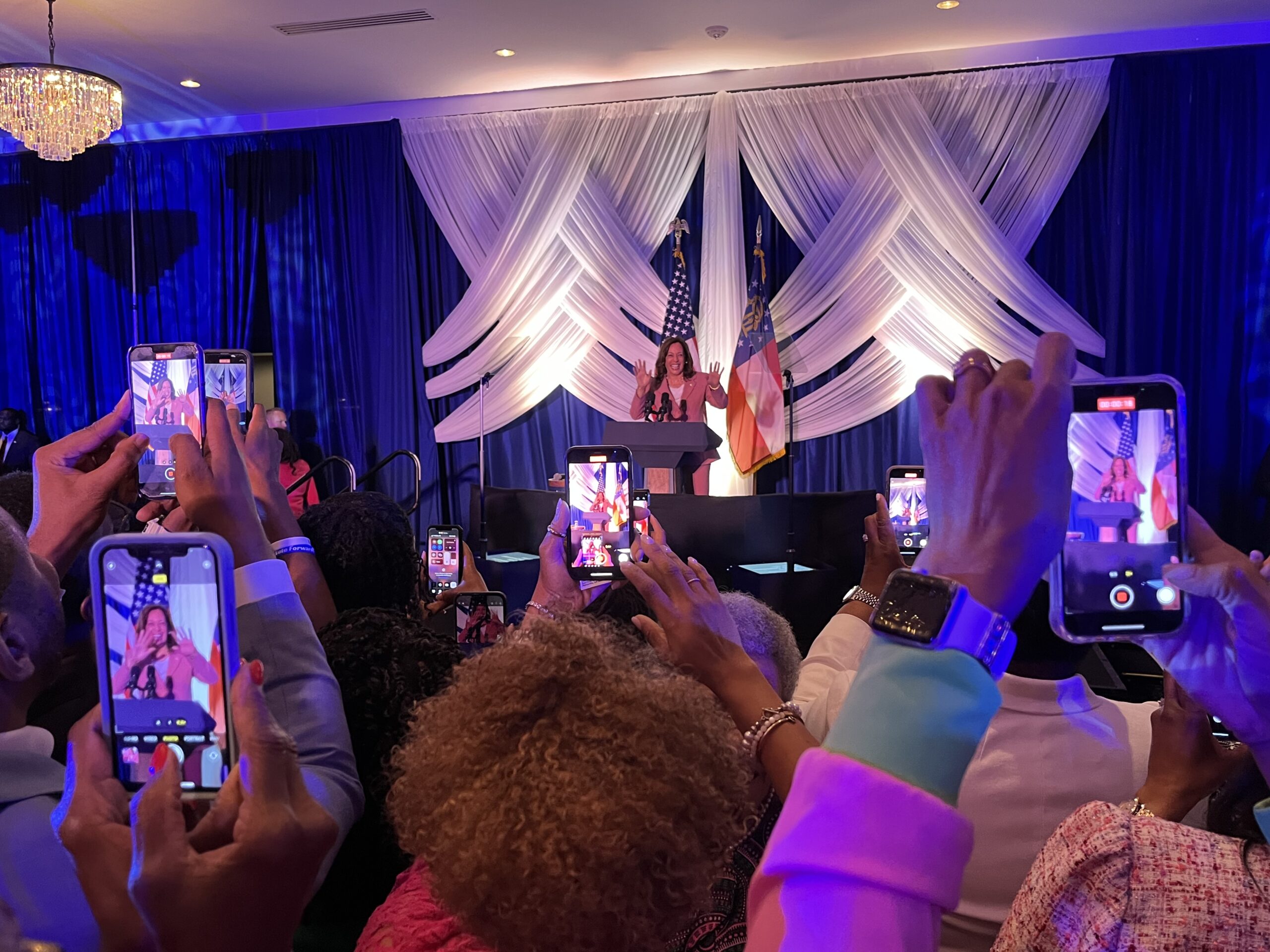 Harris was greeted at the Democratic Party of Georgia’s “spring soiree” to chants of “four more years.” Before the gathering, which was held at a Buckhead events venue, Harris was at a private fundraiser at a home in southwest Atlanta.