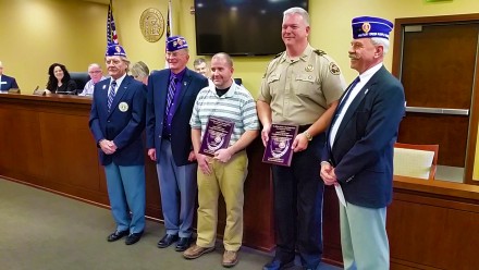 Habersham County Sheriff Joey Terrell and Deputy Corporal Bill Zigan received First Responder Citations this week from the Military Order of the Purple Heart (MOPH). Members of the Northeast Georgia Chapter 531 of MOPH were on hand at Tuesday’s Habersham County Commission meeting.