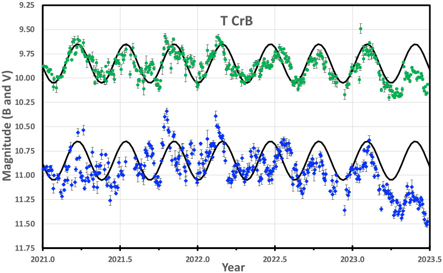 Any chance of this dip being a fluke (which wasn’t very likely to begin with) went away when another dip was witnessed in 2024. Astronomers B. E. Shaefer of Louisiana State University along with B. Kloppenborg and E. O. Waagen of the American Association of Variable Star Observers (AAVSO) announced this dip last year and initially forecast the next nova in September of 2024, plus or minus a few months. This dip can be seen as the big drop in blue and green wavelengths from the black line representing “normal” below. It is most obvious in the blue wavelength, hence the much bigger drop.