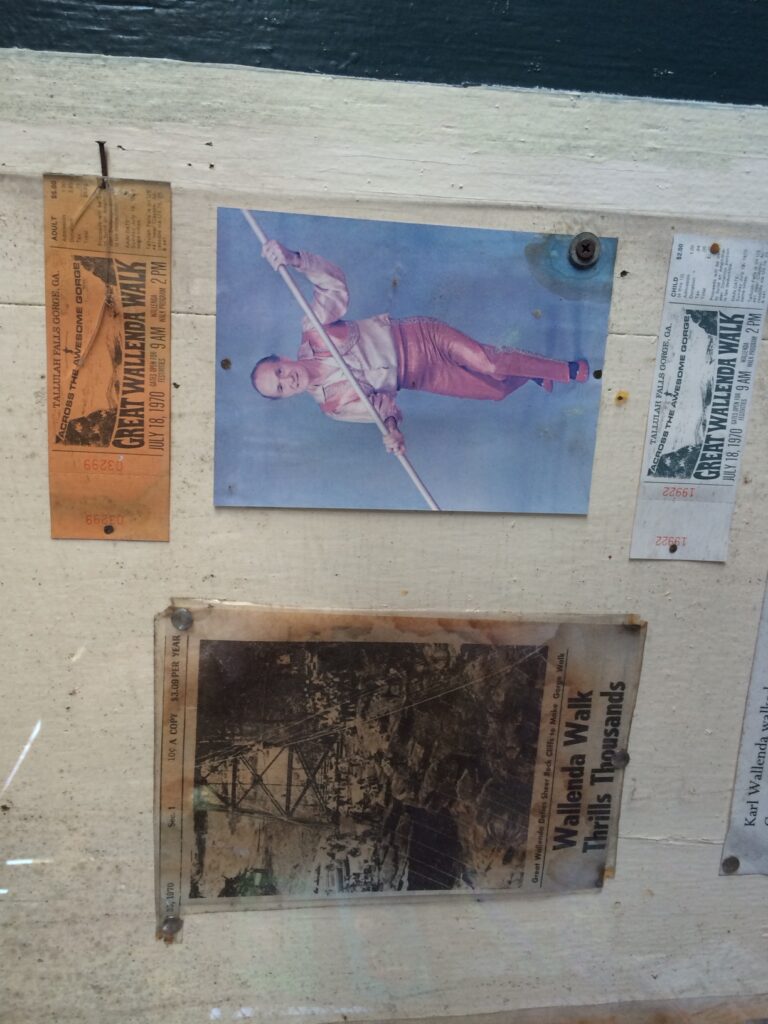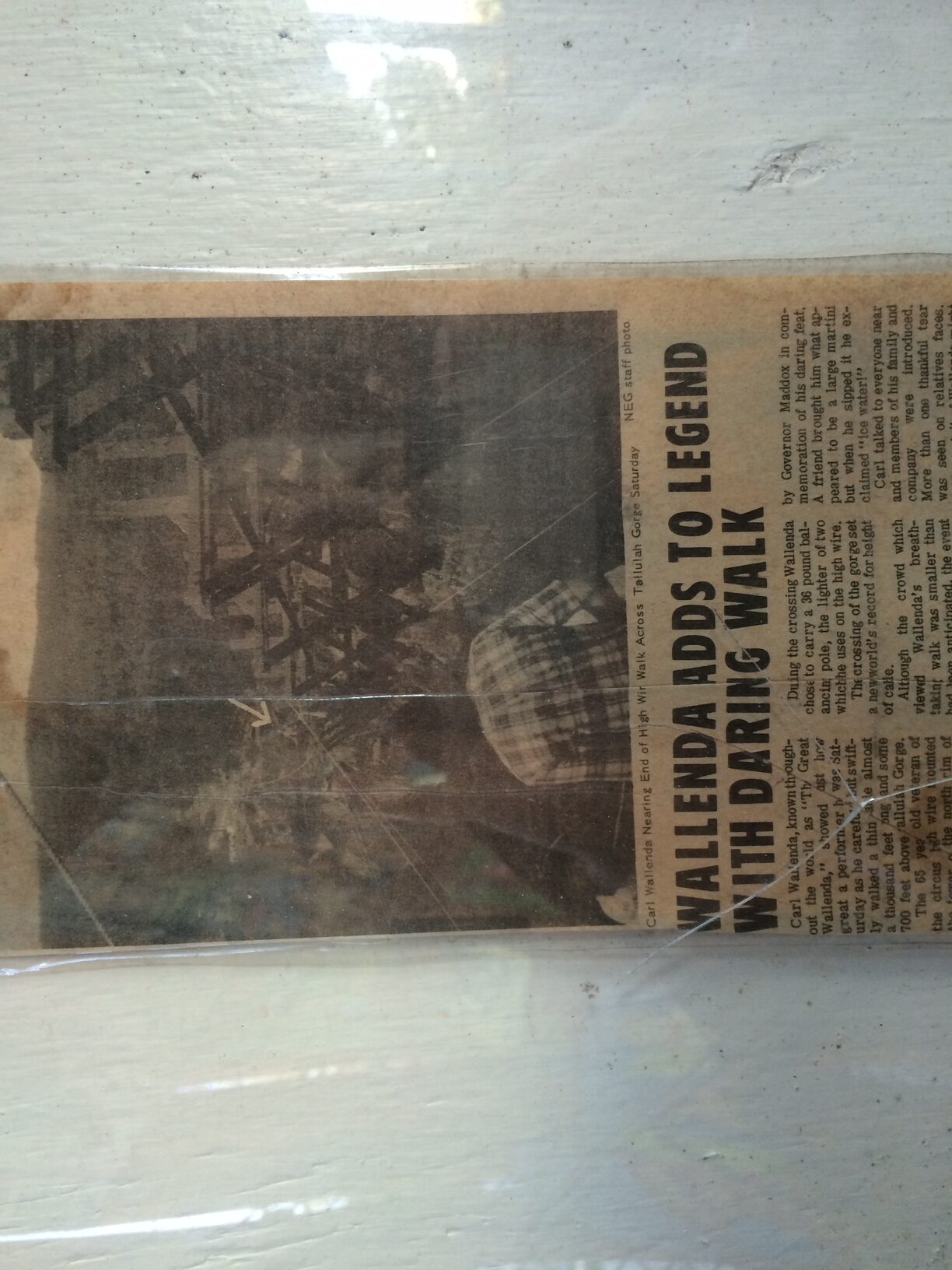 The seventh-generation aerialist is a member of the famous Flying Wallendas which was founded by his great-grandfather Karl in the 1920s. Karl Wallenda walked a quarter of a mile across a 700-foot deep section of Tallulah Gorge on a high wire on July 18, 1970. It’s the kind of stuff legends are made of and around Habersham County Karl Wallenda remains a legend. Flyers and newspaper clippings of his walk “Across the Awesome Gorge” are posted on the porch outside the Tallulah Point store in Tallulah Falls. Locals still remember that day.